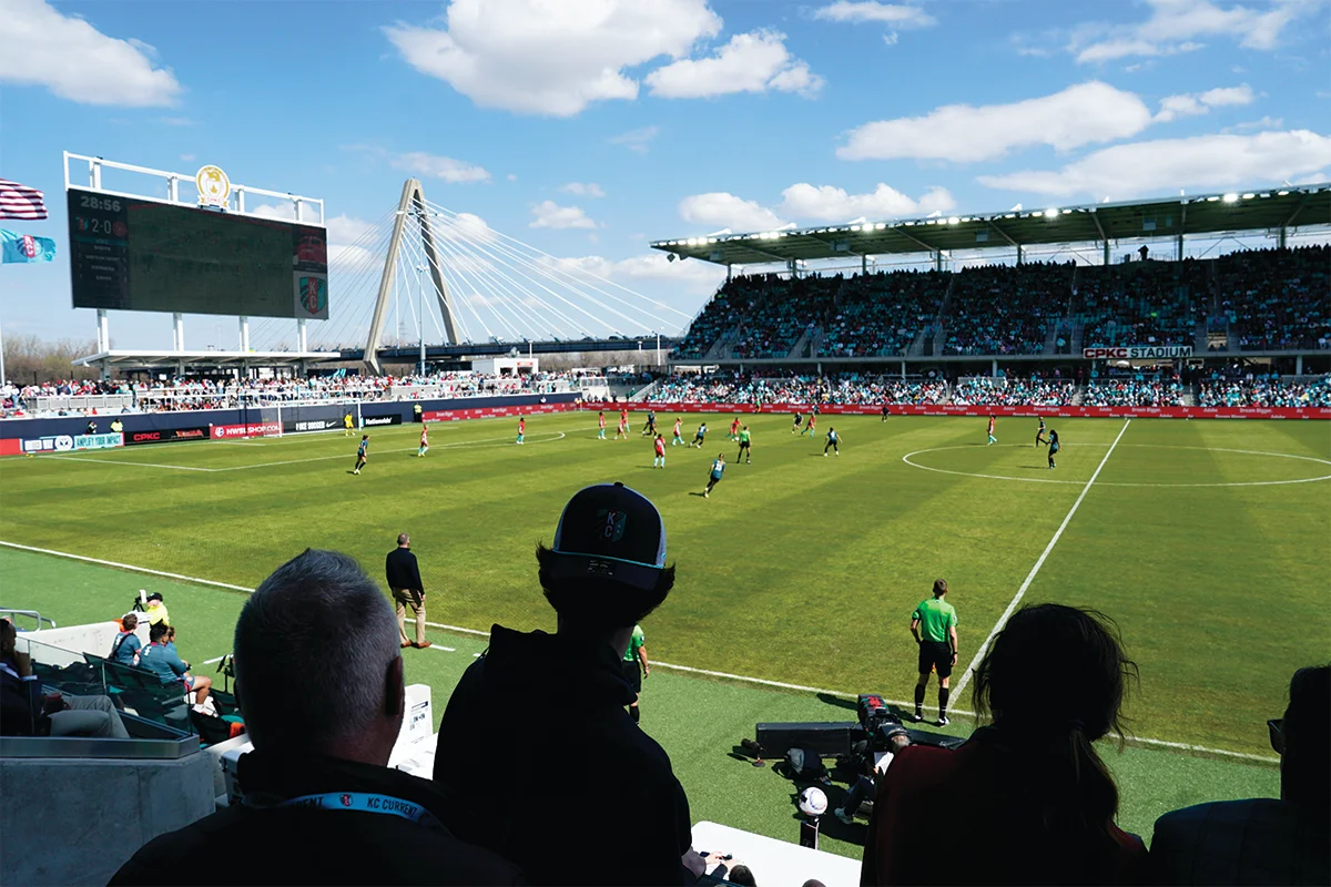 Danielle Russell was on hand for the match. As vice president of the KC Blue Crew, the Current’s official fan group, Russell has been following women’s soccer in Kansas City since 2013, when now defunct FC Kansas City was one of the league’s founding eight clubs. Having watched that team play on high-school fields and city parks, Russell burst into tears upon entering CPKC Stadium. “It was so overwhelming,” she says. “This is our home, it was made for women—instead of women being there as well.”
