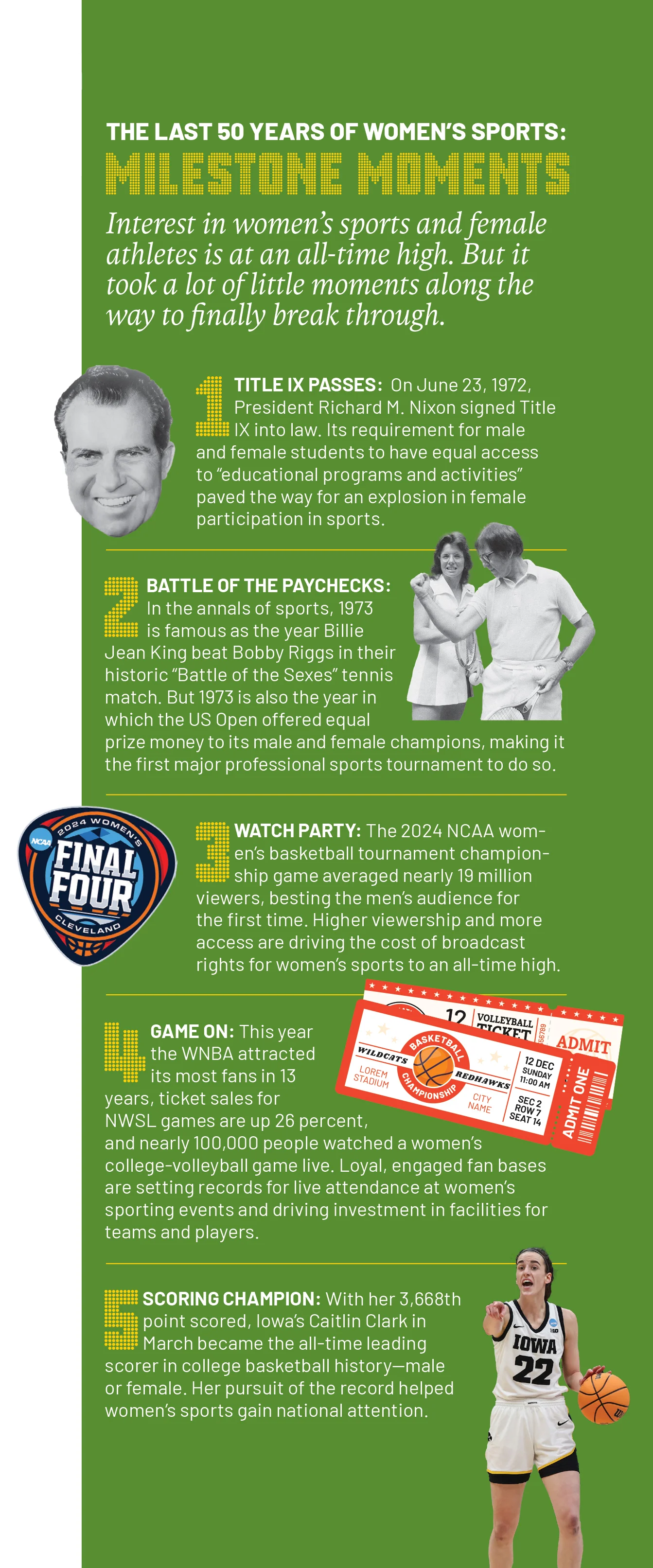 The numbers tell the story: The championship game of the NCAA Division 1 women’s basketball tournament, featuring Caitlin Clark in her last game as an Iowa Hawkeye, averaged nearly 19 million viewers. That was about 4 million more than watched the men’s title game—the first time ever that the women’s championship attracted more viewers than the men’s. For the NWSL, ratings were up 41 percent and average ticket sales grew 26 percent during its most recent season. The WNBA attracted its most fans in 13 years. But it isn’t just marquee sports getting attention. More than 92,000 fans packed the University of Nebraska’s football stadium last year to watch the women’s volleyball team, the largest live audience ever for a women’s sporting event. And over the last two years combined, the Women’s College World Series in softball drew more viewers than the Men’s College World Series.