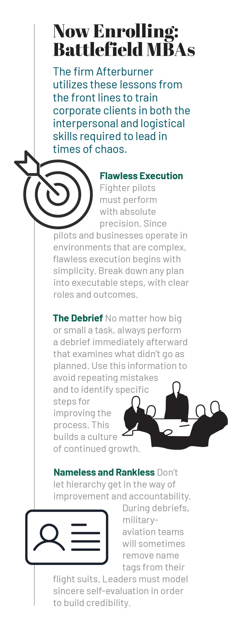 After the allotted time, the trainees are shown how to perform a debrief, a critical practice in the military for assessing performance and improving outcomes. They start by watching a video simulating the deployment of their operation. Meier’s team executes a successful mission. Others lose an aircraft. It’s a stark reminder of what error represents in a service context. “You don’t have to be a fighter pilot to think like a fighter pilot,” says Christian “Boo” Boucousis, CEO of Afterburner, which trains civilian businesses in military aviation methods. “In business, a lot of times there is a gap between strategy and execution. We help close that gap.”